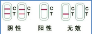 3.無效:控制區(qū)(C)無色帶出現(xiàn)。任何情況下,控制區(qū)(C)均應(yīng)出現(xiàn)一條紫紅色條帶,如控制區(qū)無紫紅色條帶出現(xiàn),表明發(fā)生操作錯(cuò)誤或試劑盒變質(zhì)失效,應(yīng)重新檢測。